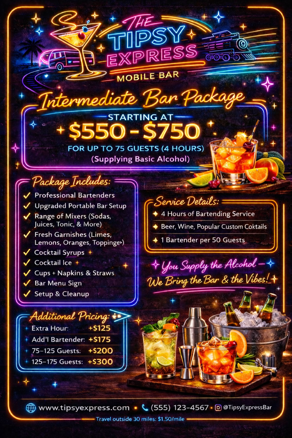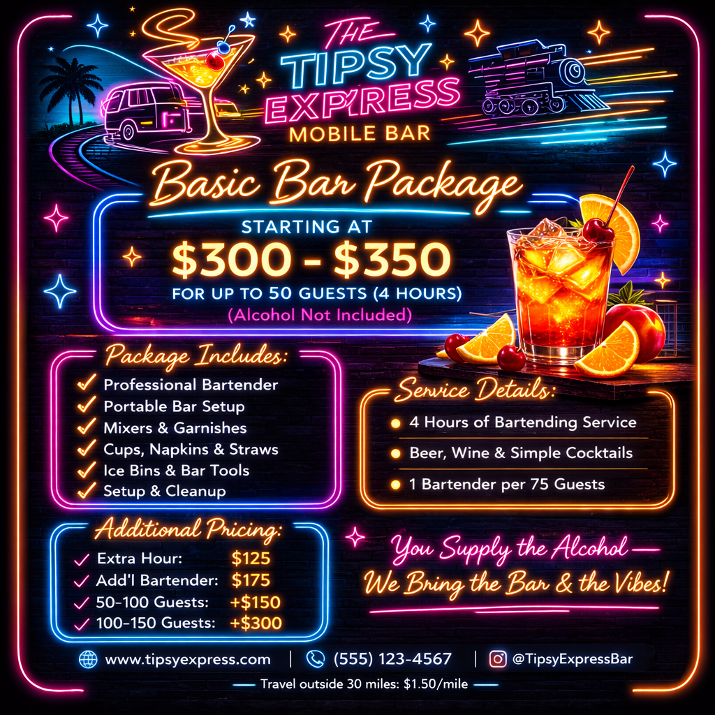 Tipsy Express Mobile Bar Services brings a stylish, full-service bar experience directly to your event. From weddings and private parties to corporate gatherings and celebrations, our professional bartenders craft delicious cocktails and provide a fun, elevated atmosphere your guests will love. With customizable drink menus, quality ingredients, and a polished mobile setup, Tipsy Express ensures every event runs smoothly while keeping the drinks flowing and the good times rolling.